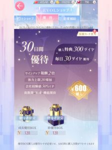 - 毎日優待券を購入した画面にいくとダイヤ30個を受け取れます。一応「!」のマークで取り忘れ防止みたいな告知はあります)